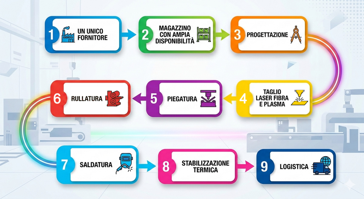 rullatura mediante curvaprofili, pressopiegatura, stabilizzazione termica, rullatura mediante calandre, saldature ed assemblaggi.